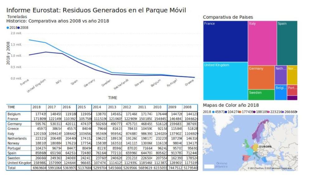 En cuanto parámetros de circularidad y gestión de los residuos que se generan en el parque automovilístico en España, tenemos que mejorar cuando realizamos una comparativa con respecto a otros países de nuestro entorno, aunque no generamos tantos residuos como algunos de los países mas importantes de la UE no reciclamos y recuperamos en cifra porcentuales tanto como estos países. Sin embargo hay una cifra esperanzadora con respecto al resto de países de la comparativa, la reutilización, el mercado de segunda mano de vehículos, que nos puede hacer entender que quizás los proyectos de transformación de vehículos de combustión en eléctricos con el objetivo de prolongar su ciclo de vida, en España podría tener cierta aceptación, si se acompañaran con ayudas. El resultado es el mismo, apostar por lo eléctrico frente al motor de combustión mas contaminante, y el impacto medioambiental doblemente positivo. También decir que no supondría perdidas importantes para los fabricantes y concesionarios al posibilitar la oferta de nuevos productos y servicios con el objetivo de fidelizar clientes a sus marcas. Es un concepto muy circular que está cobrando gran relevancia en algunas de grandes marcas no solo del sector automoción, que es fabricar productos que duren mas tiempo.