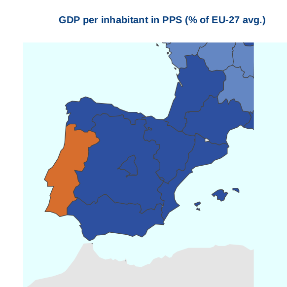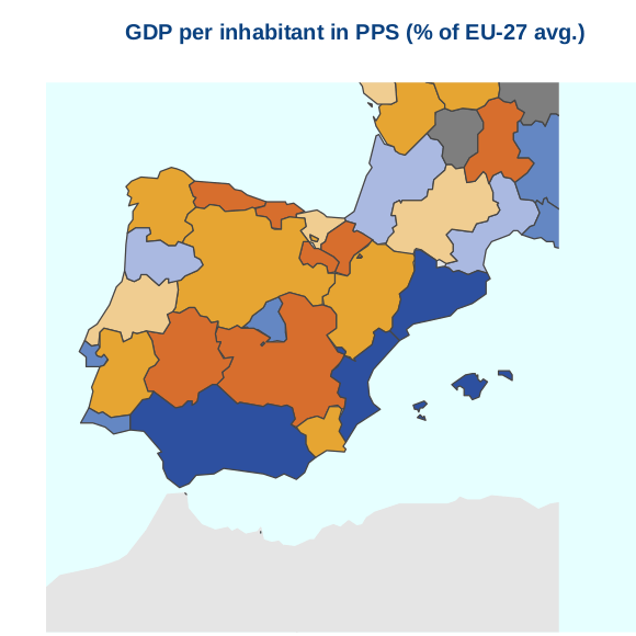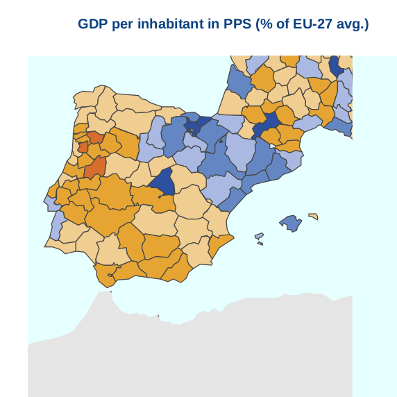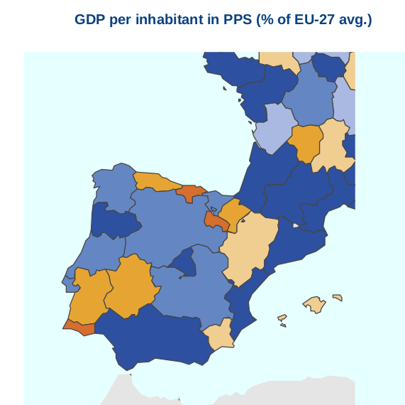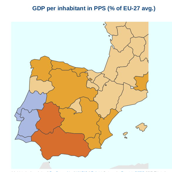 En cuanto a las tasas del PIB/GPB por habitante, con respecto a la media de los países de la Unión Europea, en Castilla La Mancha estamos en un 72% con respecto al porcentaje total de la media de los países miembros. Que significa esto, que seguimos aportando per cápita menos producto interior que otras regiones, y si es cierto y ojala no lo fuera que estamos por debajo de la media, a la hora de generar valor al PIB, a la hora de generar riqueza o valor en determinadas regiones de España, con respecto al valor final del Producto Interior Bruto del País. En términos provinciales por ejemplo la Provincia de Guadalajara estaría en cifras similares, mientras que si realizamos una comparativa con provincias como Madrid este indicador supondría un 125%, estando por encima de la media, Barcelona un 110% o Vizcaya con un 113%. Por todo esto, podemos extraer la conclusión que la concentración de riqueza o producto interior bruto, no es homogénea en un país como España. Este indicador, nos da una idea de como de homogéneo es un país a la hora de aportar valor al PIB, y en términos regionales tendríamos el siguiente mapa de color donde los colores azules nos indican las zonas mas homogéneas en cifras cercanas a la media de los países europeos.